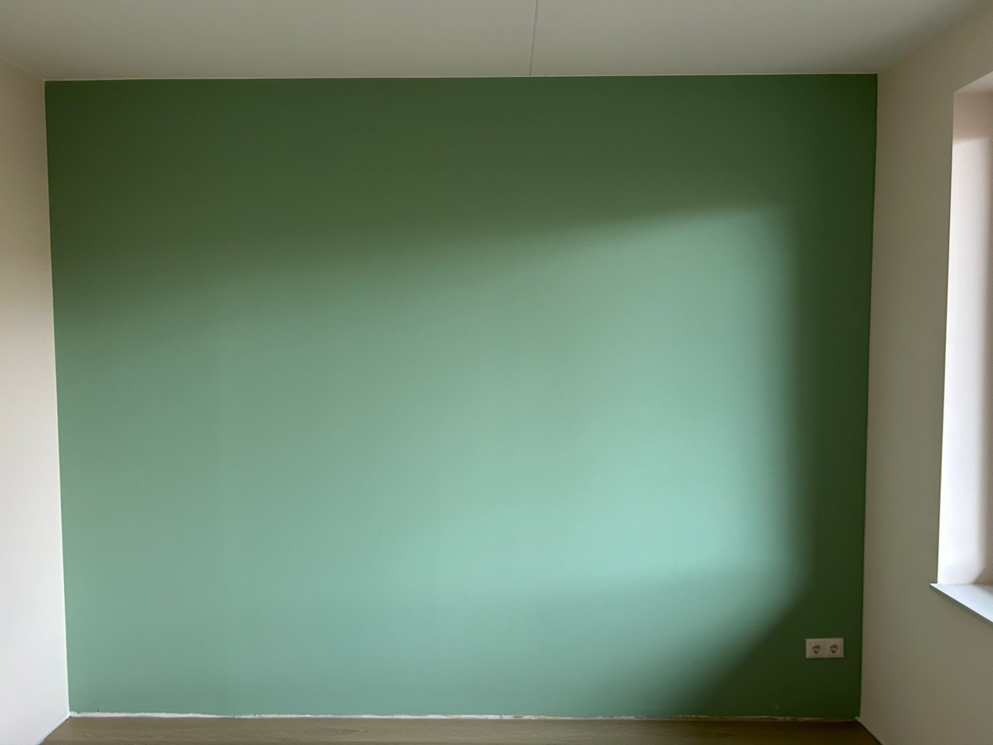 Een donkergroene accentmuur kan een ruimte volledig transformeren. Voor dit project hebben wij een diepe, rijke groene tint aangebracht die perfect harmonieert met het bestaande interieur. De muur is in twee lagen aangebracht voor maximale dekking en kleurdiepte.